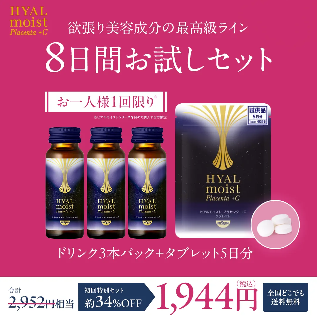 ドリンク定期コース(プラセンタ+C / W / 発酵液)をご利用いただくと、お届けごとに、「ヒアルモイスト プラセンタ +C 3本 (1,944円)」または「ヒアルモイストW3本(1,620円)」をプレゼント。