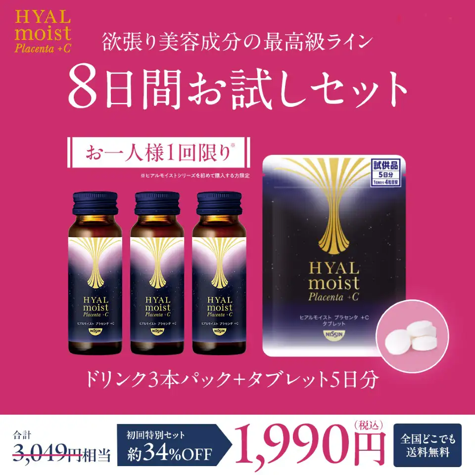 ドリンク定期コース(プラセンタ+C / W / 発酵液)をご利用いただくと、お届けごとに、「ヒアルモイスト プラセンタ +C 3本 (1,944円)」または「ヒアルモイストW3本(1,620円)」をプレゼント。