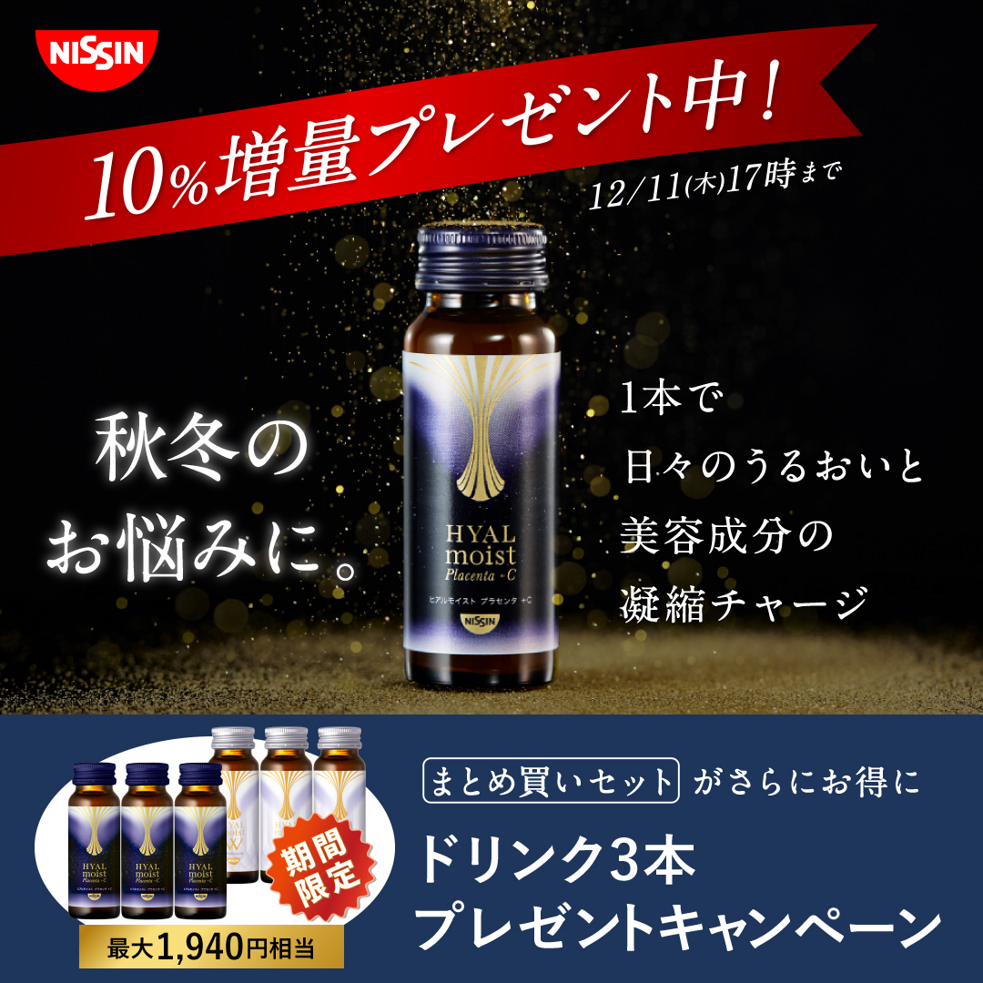 ドリンク定期コース(プラセンタ+C / W / 発酵液)をご利用いただくと、お届けごとに、「ヒアルモイスト プラセンタ +C 3本 (1,944円)」または「ヒアルモイストW3本(1,620円)」をプレゼント。