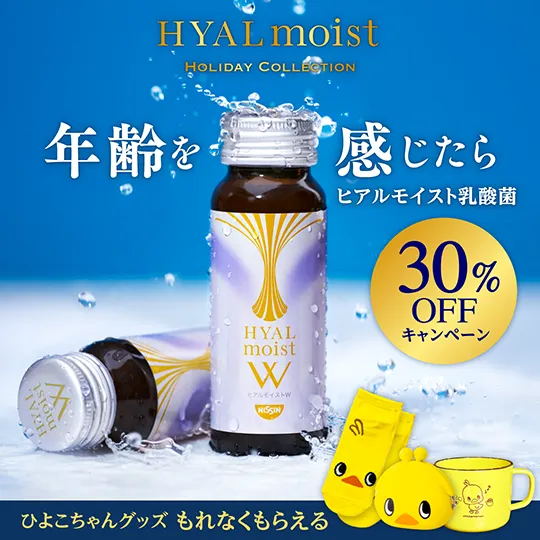 ドリンク定期コース(プラセンタ+C / W / 発酵液)をご利用いただくと、お届けごとに、「ヒアルモイスト プラセンタ +C 3本 (1,944円)」または「ヒアルモイストW3本(1,620円)」をプレゼント。